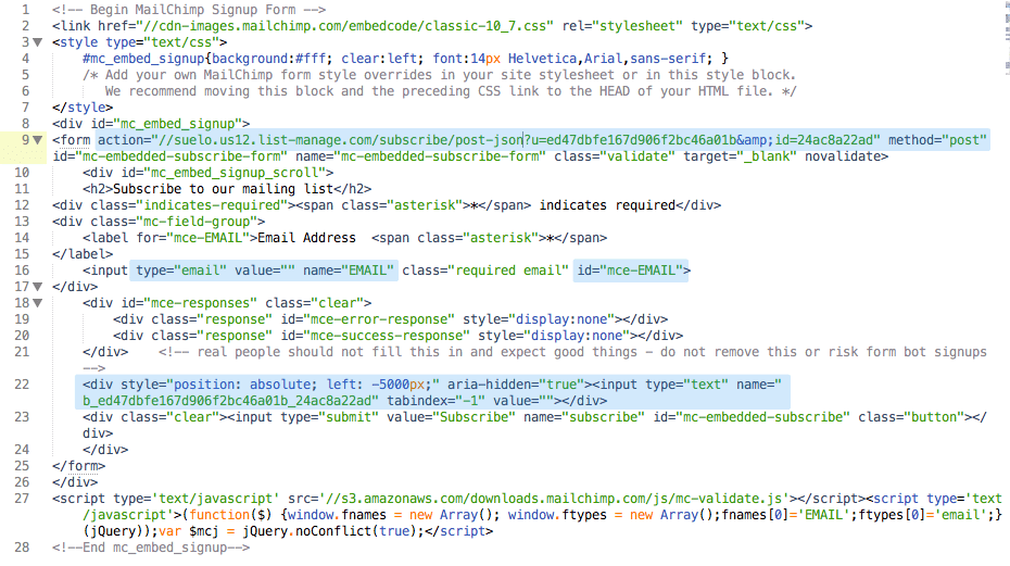 type,nameandidto your input - it should look like this:<input type="email" value="" name="EMAIL" class="form-control input-lg" id="mce-EMAIL"> - Find input which prevents bot signups and paste it somewhere in the form - it should be hidden!